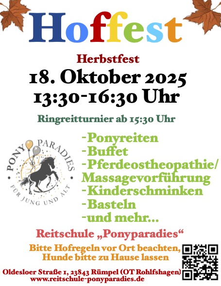Am 12.10.2025 bieten wir Ponyreiten auf dem Kartoffelfest auf Hof Burmeister an. Kommt gerne vorbei!